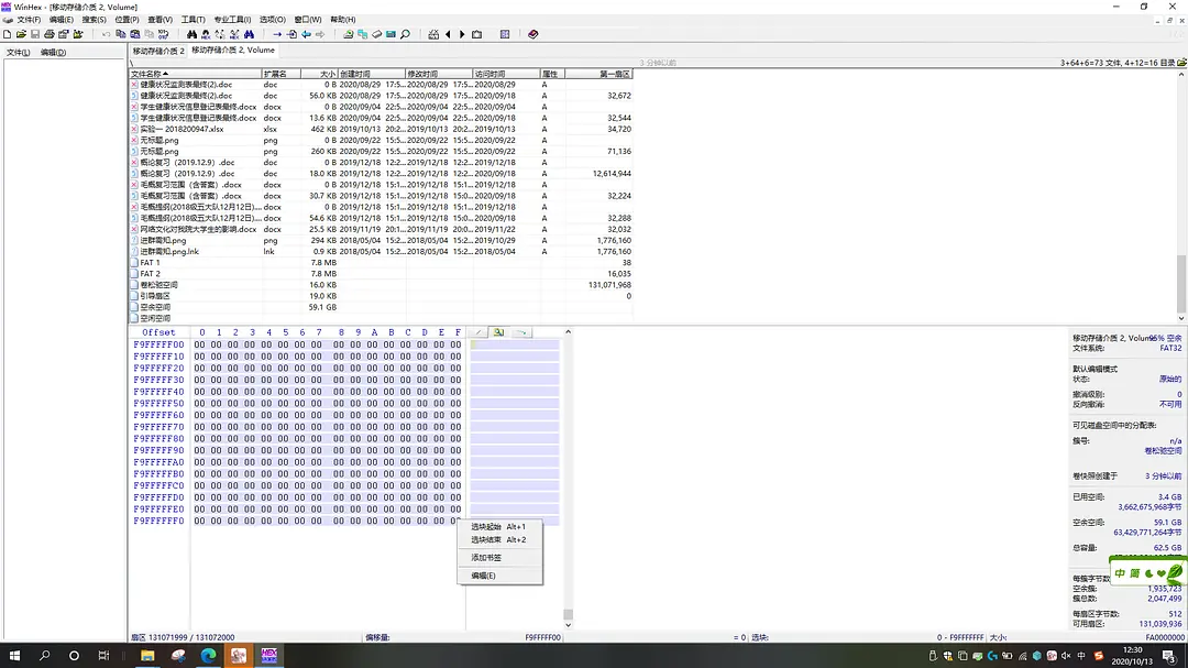 右键下方的十六进制数(两个十六进制数为一Byte),选择选块开始。