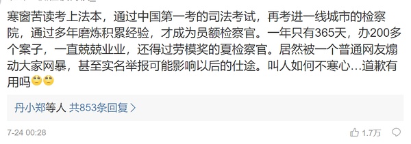 因为检察官引起争议后,有人搜出了检察官的姓名和电话。不清楚到底有多少人去电骂了她,但是她老公最后直接出来盖章这是受害者引导指使的对检察官的网暴