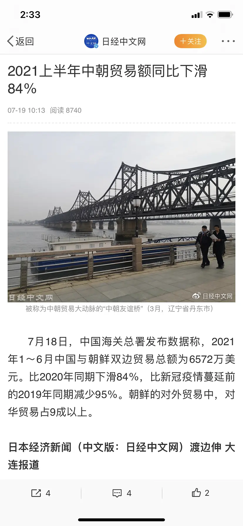 2021上半年中朝贸易额同比下滑84%