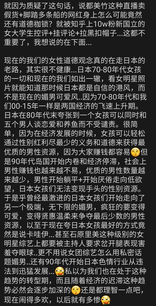 把这一套放到阿钟来那就更搞笑了,受过良好教育、有一整个家庭支持的城市中产阶级独生女巴不得小黄男全体摆烂。你吓唬谁呢?