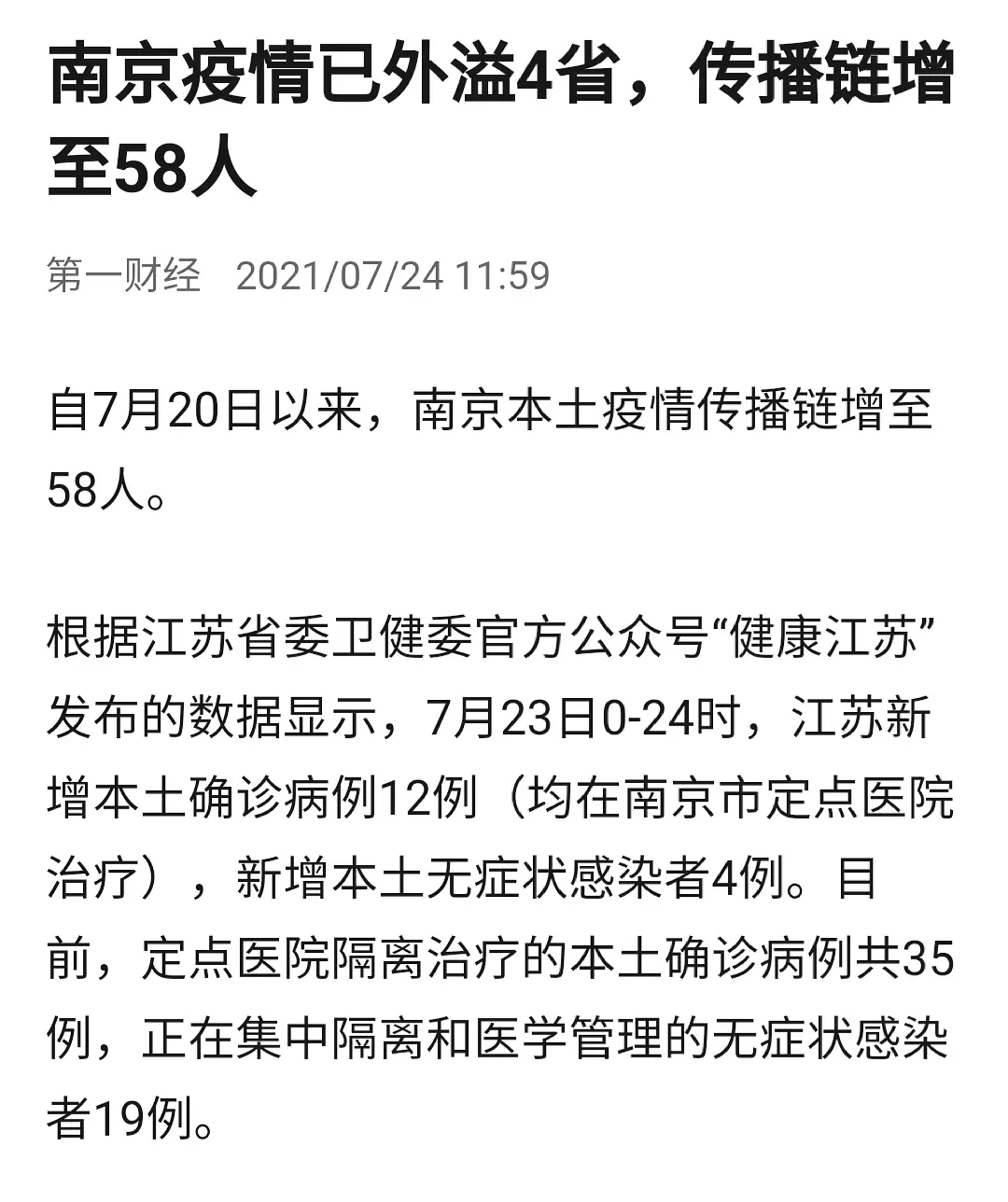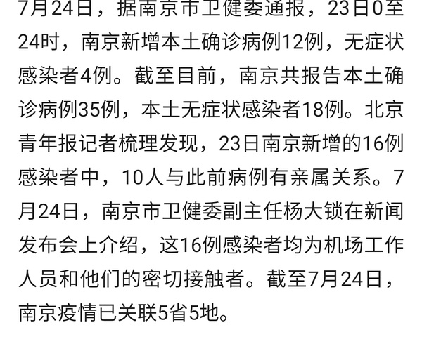 7月25日上午,江苏南京召开疫情防控新闻发布会。会上通报,7月24日0-24时,南京新增本土确诊病例2例(普通型),本土无症状感染者2例。