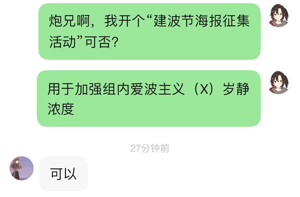 7.25-8.9日,组员可以给本人私发海报,本人会将其贴在专门的海报展示楼;