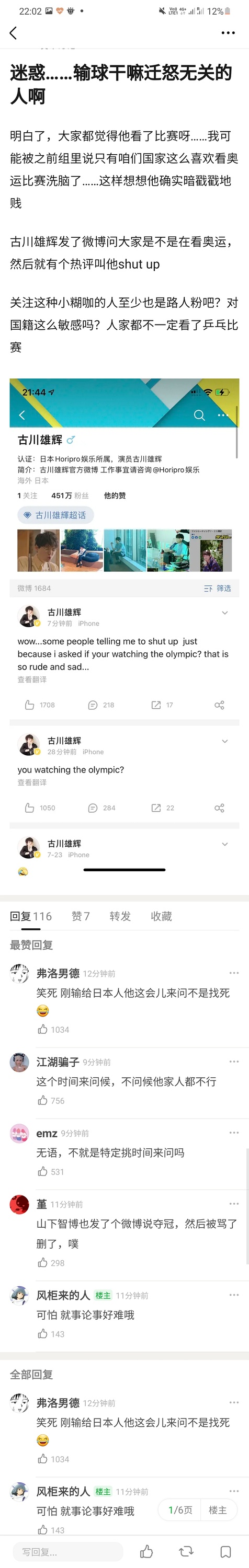 我太阴暗了,去八组开心围观菟友气抖冷了。本子那个女选手应该真的很强,菟友们恨得那叫一个咬牙切齿。说来说去还是只会看🥇,懂球的人会不欣赏优秀球员?