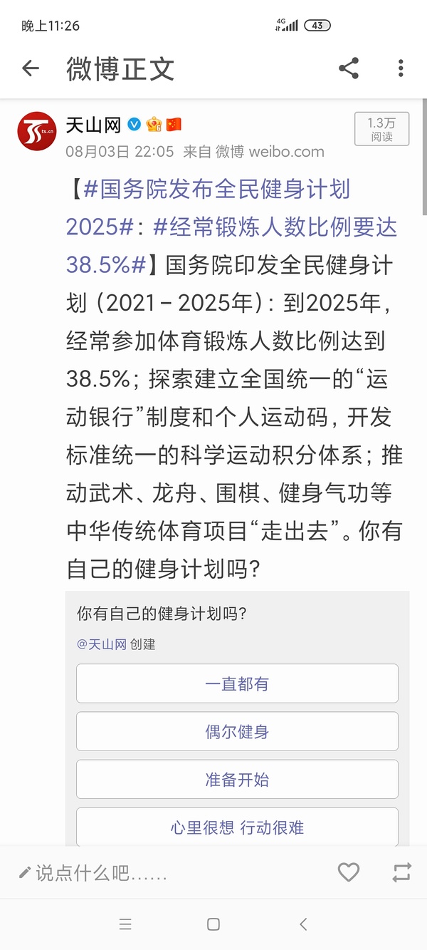 “尊敬的国民们,今天你们健身了吗?”