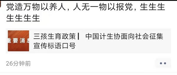 不婚不生,监狱一生。 多生猛生,幸福一生。 活到老生到老,幸福社会我来保。你不生,我不生,廉价劳力哪里增?多生猛生好,遗产争夺少不了;多生猛生好,赡养推诿少不了。多生猛生好,孰家go v不养老