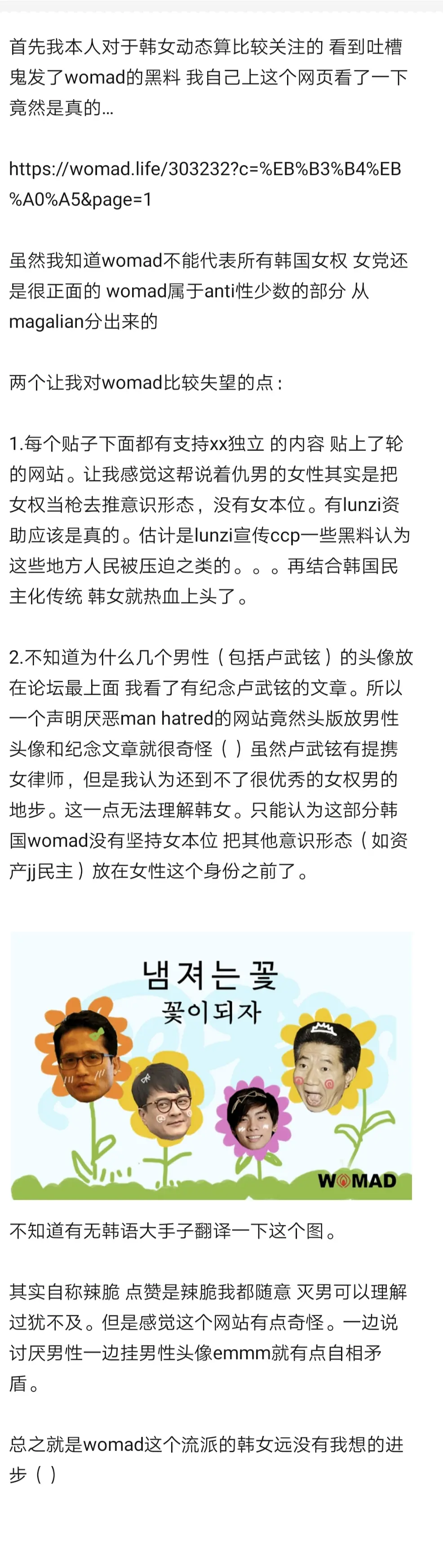 womad是南韩一个激进femenist网站 我觉得奇怪的是这个网站怎么和lun有关系的 WOMAD is an online community only for women where women’s rights come before any other rights. We are here to reconcile with our shared experiences as women. We are here to retrieve what is ours from men to create and run matriarchal society. We are here to bathe in male tears. We are here to laugh at male fears and dicks.