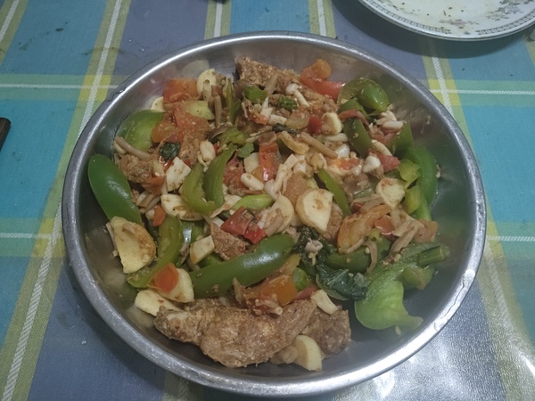 包含了豆腐、鸡蛋、五花肉、苦瓜和鱼的什锦炒菜