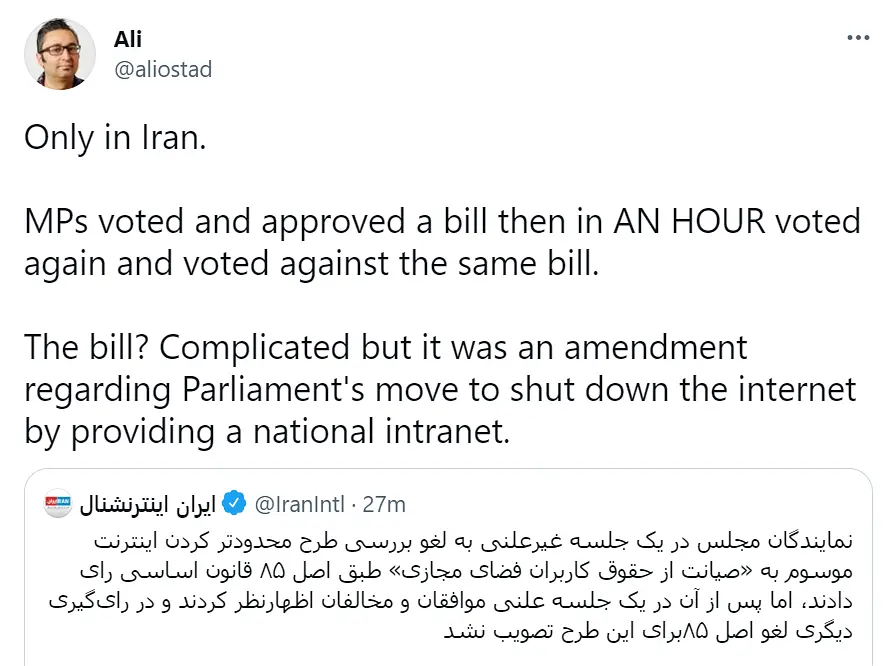 目前的情况是伊朗议会先通过了这个关闭互联网改为国内网的法案,然后过了一个小时又废除了这个法案,看来互联网在伊朗还能再存在一段时间。这个法案公布以后,大量伊朗人开始搜索“移民”。伊朗从2011年开始就公布要筹划建立清真互联网🌐,现在应该是要落实了。