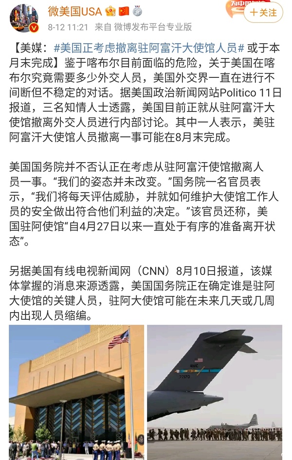 美使馆将搬往Kabul机场办公,考虑开设每日航班撤离剩余人员。Kabul政府已经结束了。