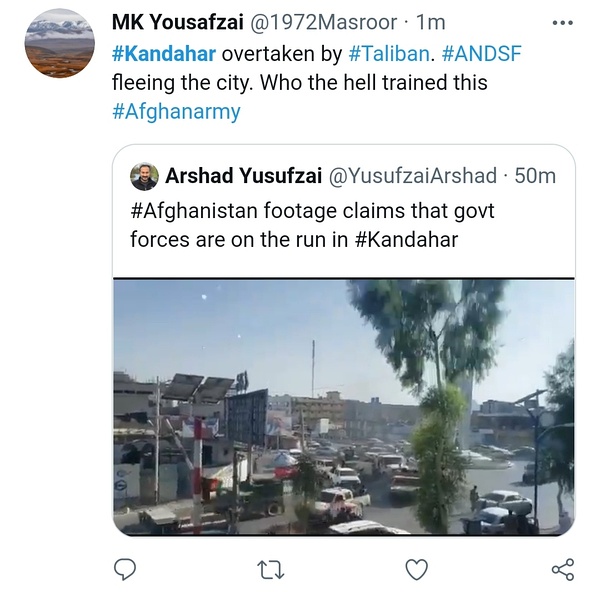 传Taliban已控制坎大哈市区,省长等倌员试图从机场撤走。