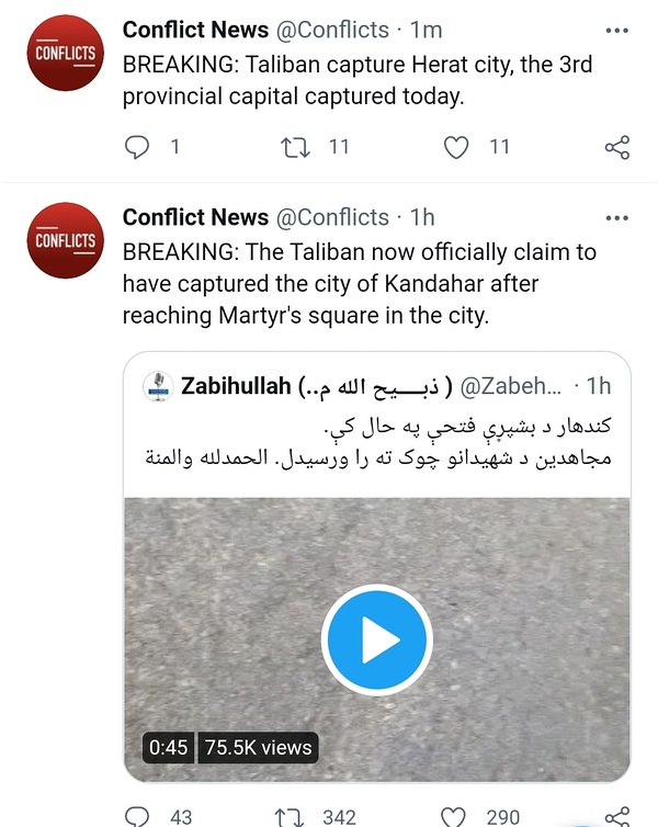 Taliban攻占第二大城市坎大哈和第三大城市赫拉特