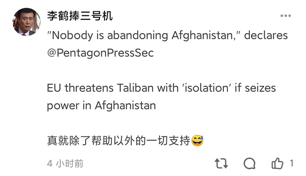 Shimokita810tlb网络舆论战算是抓住那些只会做PPT的阿富汗GOV公务员的要害了,还没打进城看了TLB媒体宣传战就吓得背刺冰队跑路,那些在叙利亚战争里负责打网络舆论战的卡塔尔媒体人现在是不是在卡塔尔tlb金主的旗下再上岗了?