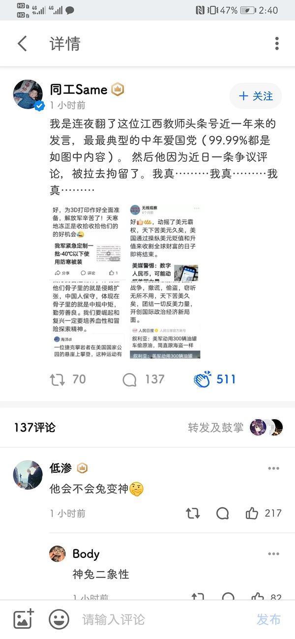 如果你看到哪个爱国正能量大v某天在一件事上理客中了,只能说明对方公关费打到了。