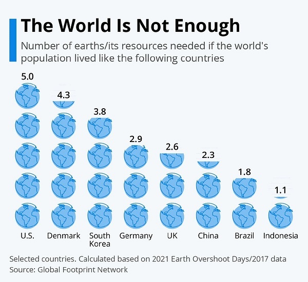 美国级的资源消耗是五个地球这种说法实在是有点吓唬人的意思,要是让所有人都像资本家那样穷奢极欲多少个地球都不够,一份几千刀的晚餐可以够多少穷人吃一顿?美国的资源浪费有多严重,知乎的一些老回答可见一斑。https://www.zhihu.com/answer/165034076