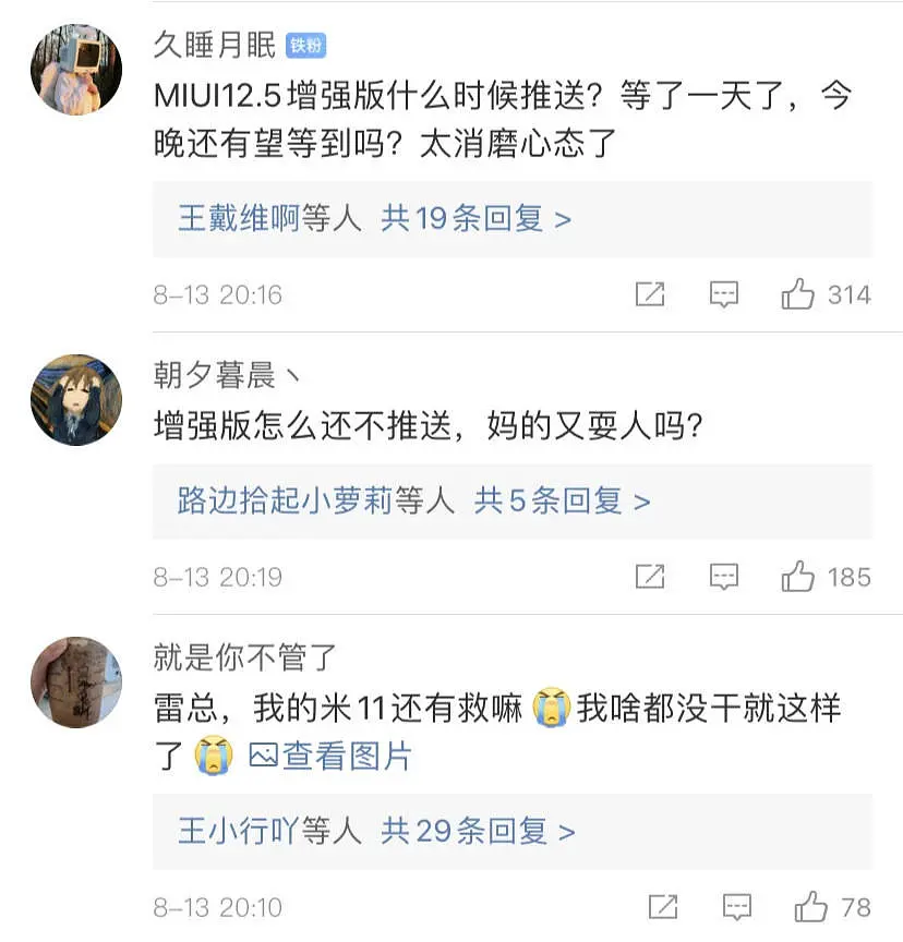 2.好像是画了个大饼说8.13开始陆续推送MIUI12.5增强版,据说改动和优化不小,评论里应该是感觉被耍猴了。
