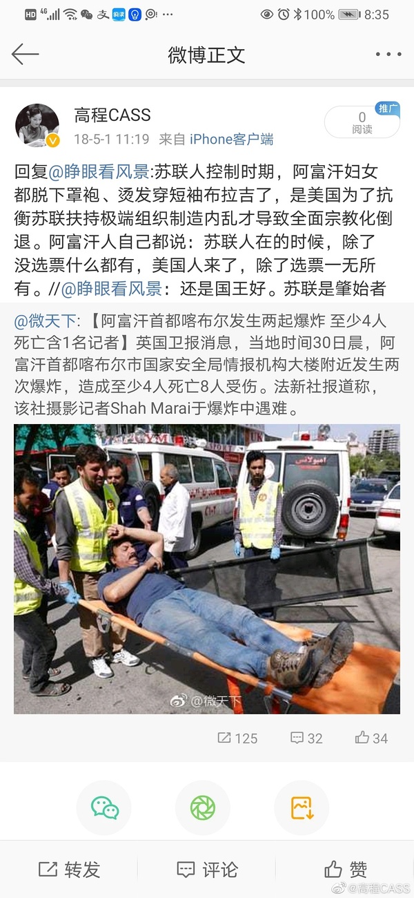 然后这一垮塌,他们就觉得美国灯塔不光明了,民主没了,自由没了,阿富汗平民要被坏蛋打了。我说难听点,他们就和某些苏粉一样,只是他们的“苏联”没有倒台。泛左翼-自由派很多有一种美国病,这和美国的大影响有关,觉得美国是万能的,是灯塔式的救星。嘴上说着自己关心人权和阿富汗人,然后张嘴就是炸平阿富汗,确实很体面,体面的爱体面的阿富汗人,不体面的就要被轰炸。冷战宣传的余波,就像之前老有人拿伊朗革命前,女生露大腿的照片来证明,昨日伊朗是进步的体面的。