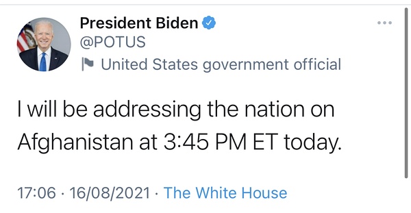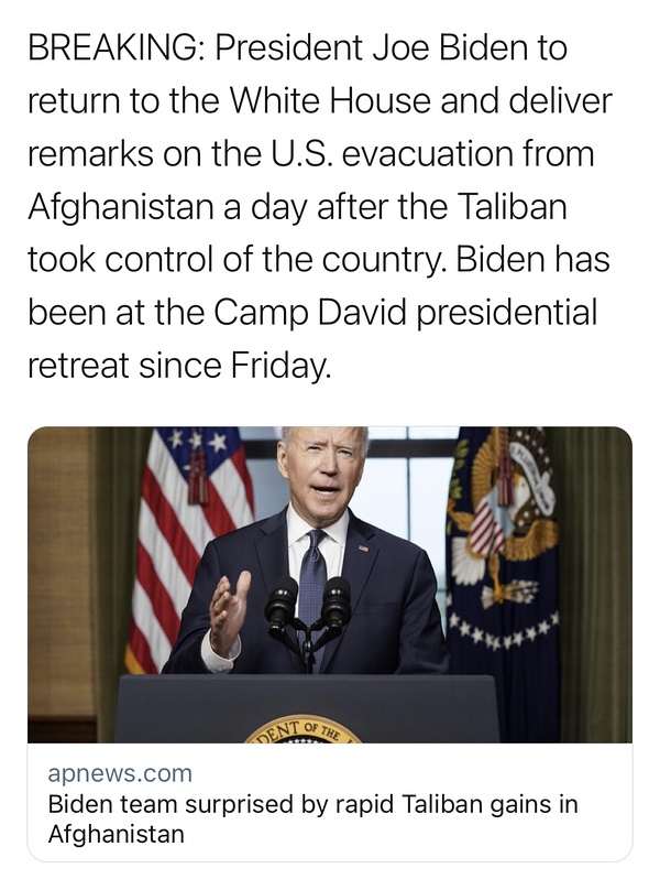 拜登刚刚从戴维营的度假中返回,准备发表就阿富汗事件的讲话。
