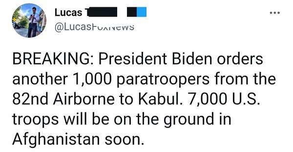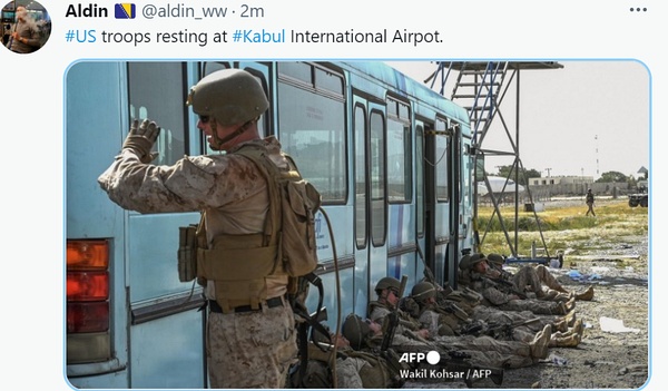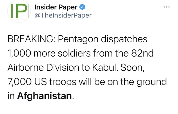 42 min ago CNN:五角大楼秘书John Kirby确认,目前有2500士兵在机场,明天将有3000人抵达,来自82师和马润,最终达到6000人。另外昨天阿美守军击毙两名tlb,击伤一人。