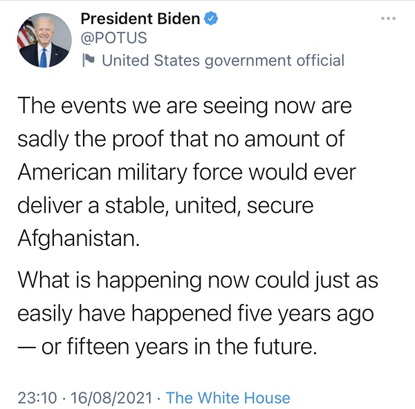 2. 前总统太拉垮,之前我让他和塔利班谈,他跟我说政府军能打不用谈。结果不但没怎么反抗,他自己还马上开溜了。(拜登特意强调美方没有预料到政府军存在大量一枪不放就投降的情况)