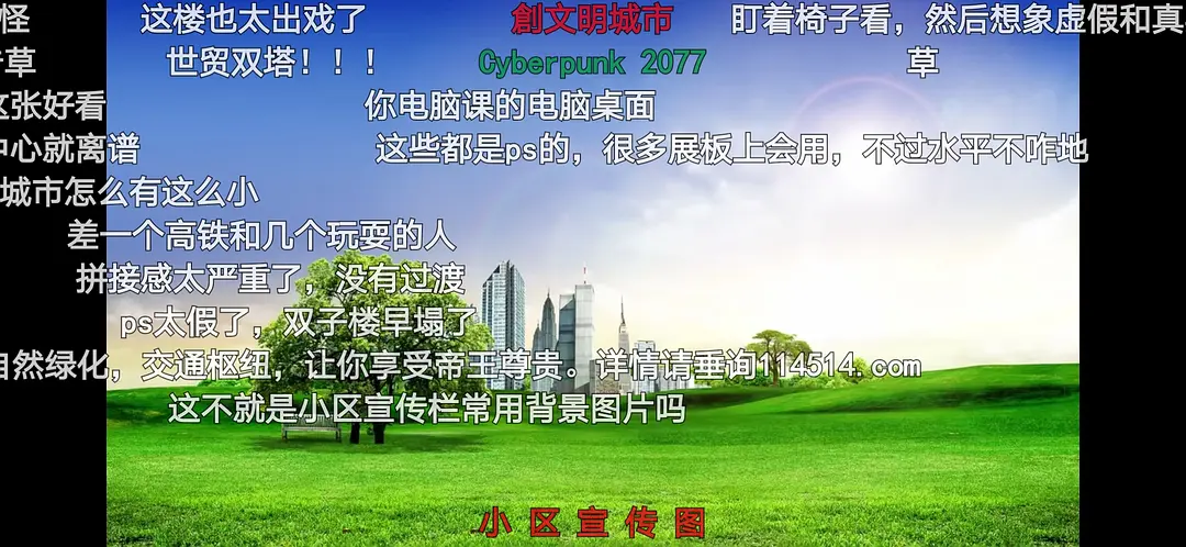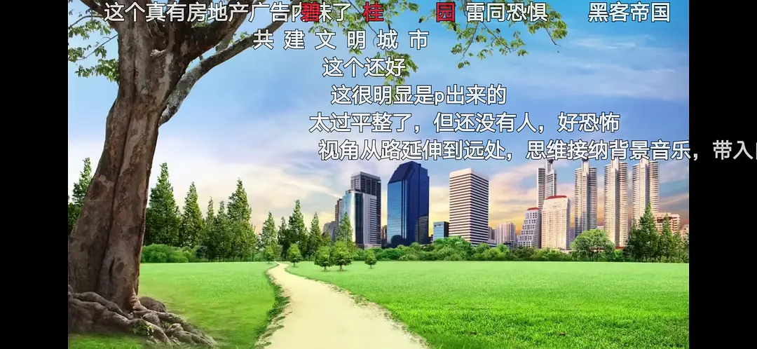 可以说,整个文明城市画就是一种空间拜物教。你在任何地方都不可能找到这种空间:其中自然的色彩饱和度如此之高,城市的建筑如此干净体面,而这两者间却没有任何的冲突。被破坏的自然没有出现在文明城市画里,不干净不体面的小街小巷没有出现在文明城市画里。让你恐惧的还不只是这点,这些画面里也没有人的存在(即使有,也是满脸微笑的,穿着体面的),说是文明,美好,家园,环保,但这些能指并不对应真的所指。你知道现实不是这样,空间恐怖谷效应这就出现了,你以为真(没有发觉时),实际却是假(你盯着看之后),这就好比,你以为这个肖像是画的真实的人,实际这个人并不存在,你发现这个人有章鱼触手般的第三只手(允许我用比较诡异的比喻)。而这些画,你一开始以为是画给你看的,你以为你是被考虑在受众里的,但是,这种粗糙,童话般的画显然是给那些只会对它们瞟几眼的人看的(或者我们说,不会挑刺的人),文明城市画里经常有说明性的文字,有些买房人不会在意广告画面里是怎么样的,他们只看得见地段和电话号码。要知道,广告是为吸引人而存在的,它不是说明书。只要有某些抓眼球的效果,这个广告的目的便达成了,熟练的受众群体看一眼某些符号就知道什么产品是为他们量身定做的。如果你认真对待了文明城市画,最深的恐惧是“我不存在”的感受,你没有出现在文明城市画里。文明城市画虽然出现在城市里,却没有城市的内容,它的视线是“自然——城市、在城市之外”,城市被化简为现代主义的楼宇,你被淹没在画里,看不见自己。这是悲剧的,在城市里生存的人却看不见自己的身影,他们的存在被否定了。