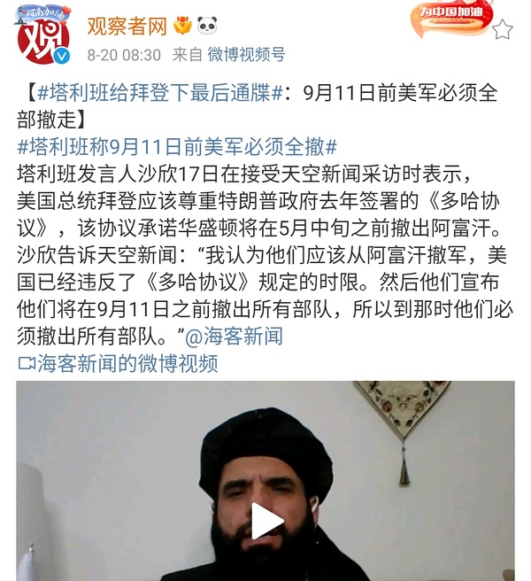 Link Icon #中方鼓励并希望阿塔落实其积极表态#【#华春莹谈应如何看待阿富汗塔利班#】近日阿富汗局势发生重大变化后,阿富汗塔利班领导人和发言人多次通过不同渠道就其内外政策作出一些表态。外交部发言人华春莹8月19日说,中方注意到这些积极表态和信号,鼓励并希望阿塔将其积极表态落到实处,同阿各党派、各民族团结起来,尽快通过对话协商建立符合阿富汗自身国情、得到人民支持、广泛包容的政治架构,施行温和稳健的内外政策,遏制各类恐怖主义和犯罪行径,确保阿富汗局势实现平稳过渡。国际社会应共同鼓励和支持阿富汗各党派、各民族团结合作,翻开阿富汗历史的新篇章。 华春莹说,我注意到有些人反复强调他们对阿塔的不信任。世界上没有任何事物是一成不变的。我们主张要用全面、联系、发展的辩证思维来认识、看待和处理问题,不仅要看过去怎么样,也要看现在怎么样;不仅听其言,也要观其行。如果不与时俱进,而是抱守固定思维,无视形势发展,那就是刻舟求剑,就不会得出符合实际的结论。事实上,阿富汗局势的急剧演变也表明,外界以往对阿形势缺乏客观判断,对阿民意缺乏准确把握。在这方面,西方某些国家尤其应该汲取教训。(记者成欣、伍岳)