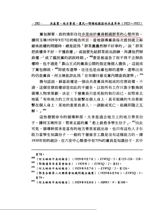 ①“Neko本人明确承认:瑞金早期的党员曾经‘百分之八十是地主富农’、‘上犹党员八十多人,地主富农占三十多人’。因而1930年反富农斗争开始后,被‘开除的地主富农有一千余人’。赣西南中共党组织和根据地,早期恰恰就是当地富有家庭的子弟利用他们在地方上的资源艰辛创立起来的。”