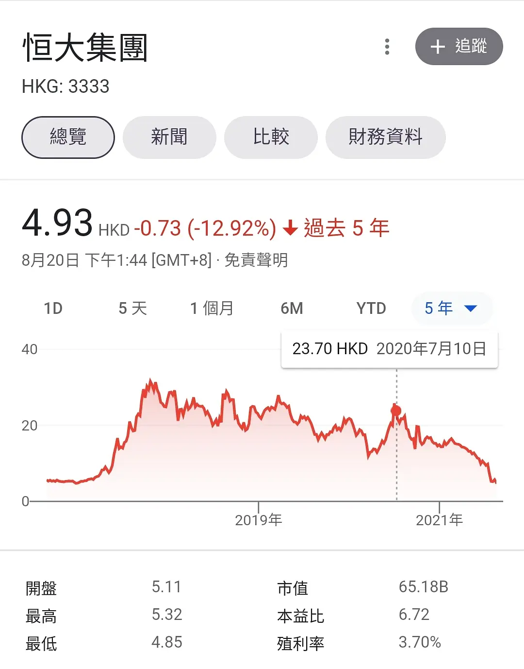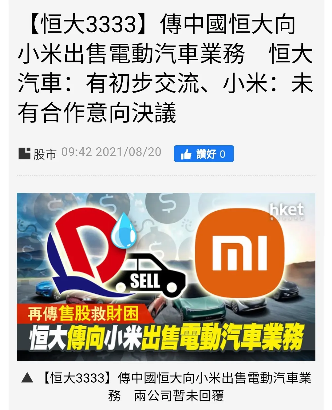 恒大新闻集中贴あかざあかり2021/08/20 05:59:34 恒大股价在8月20日已经跌到5港币以下了,创历史新低。一年前股价还有20港币。恒大汽车估计很可能会卖给小米了。Loading...Loading... Loading Spinner
