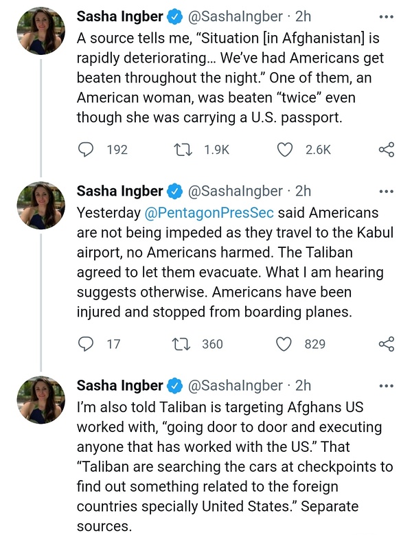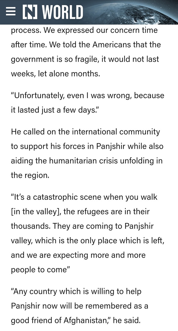 Link Icon 阿富汗前总参谋长Sher Mohammad Karimi在TRT接受采访,表示他收到很多阿富汗士冰的反映,他们收到上级要求他们回去基地不要交火的指令,说和平方案已经谈好了,结果等回了基地又被要求向TLB投降交出武器。 I have heard this from so many Afghan military personnel in the past few days. They were commanded not to fight, that a political settlement had been reached, and when they returned to their bases, they were commanded to surrender their weapons to the Taliban.