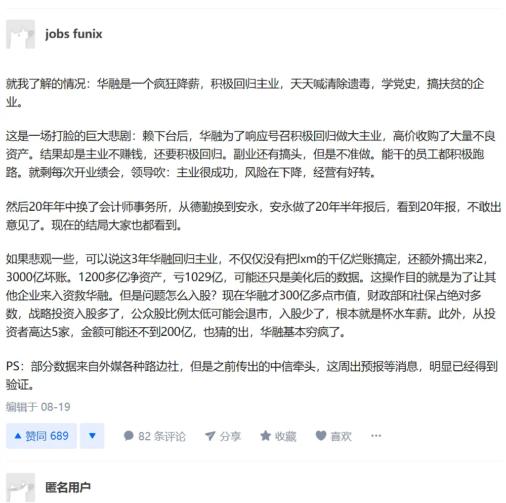 原来华融亏损1千亿还是美化后的结果あかざあかり2021/08/21 12:08:09 https://www.zhihu.com/question/480767375/answer/2070061126这天坑到底有多大,还要再找其他企业来救,属于是火烧连营了。。。Loading... Loading Spinner