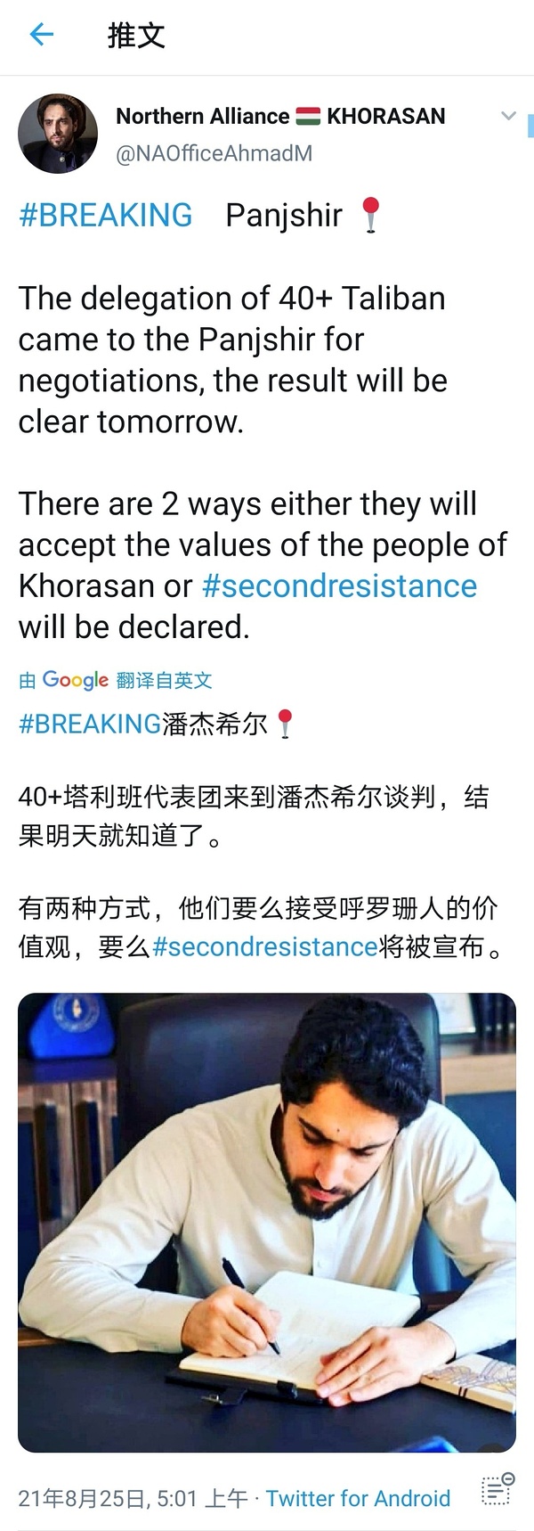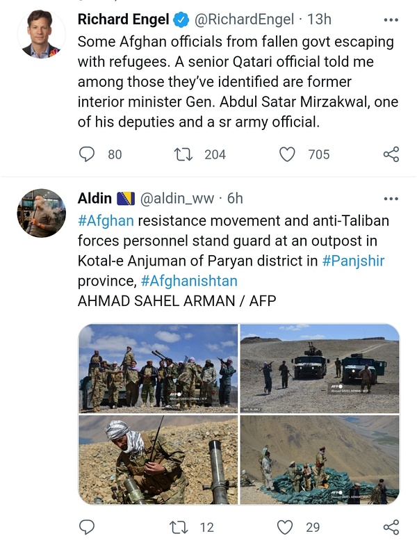 Link Icon Taliban spokesman Zabihullah Mujahid says he is 80 percent sure that there will be no fighting in Panjshir province. Taliban spokesman says efforts are ongoing to resolve Panjshir issue through talks. 看样子,TLB在潘杰希尔进展很不顺利