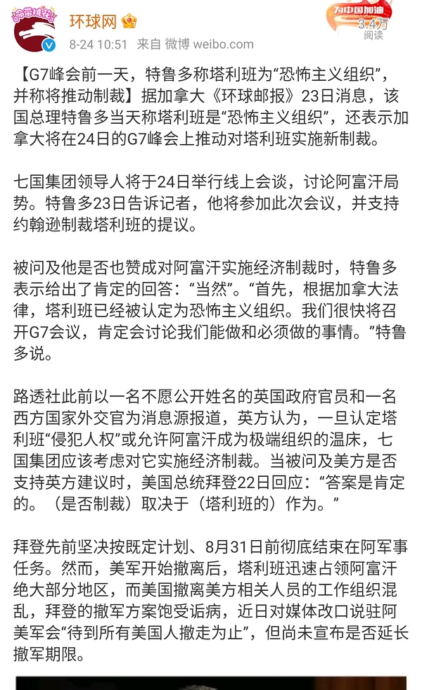 另外,很可能会G7联合制裁TLB阿富汗,到时候TLB拿什么发工资?阿富汗公务系统包括冰队已经五个月没发工资了(所以一碰就倒)。