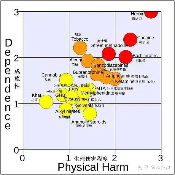 其次,如图所示,cannabis在成瘾性和伤害性上均低于烟草和酒精,如果有人提出质疑可以提供其它研究报告。