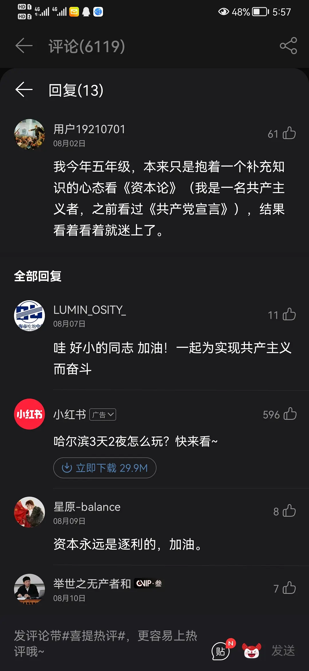 哲学社那帮高中生再怎么说也是高中生,而且家境优渥从小就不缺相关领域的训练。我读高中时也开始读《资本论》,虽然还觉得自己勉强能读下去,但现在回顾那时候表面上是看了两遍,实际上却连专业名词的定义都没搞清楚。