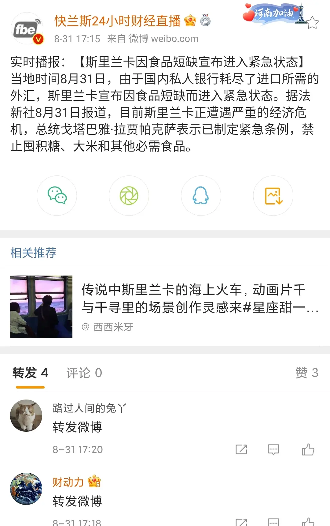 斯里兰卡也开始崩溃了あかざあかり2021/08/31 09:23:46 之前黎巴嫩已经崩溃了,现在轮到斯里兰卡了。这一波对依赖旅游的国家杀伤力太大了。Loading... Loading Spinner