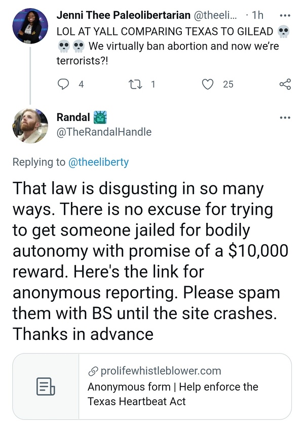 得州已经有人发起匿名举报活动,邀请您帮忙执行该法案🤮(这网站似乎屏蔽了非美国ip,反正我打不开,提示Access Denied)