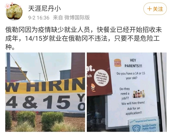 俄勒冈因为疫情很多人不敢出门工作,开始招收14、15岁的中学生送外卖