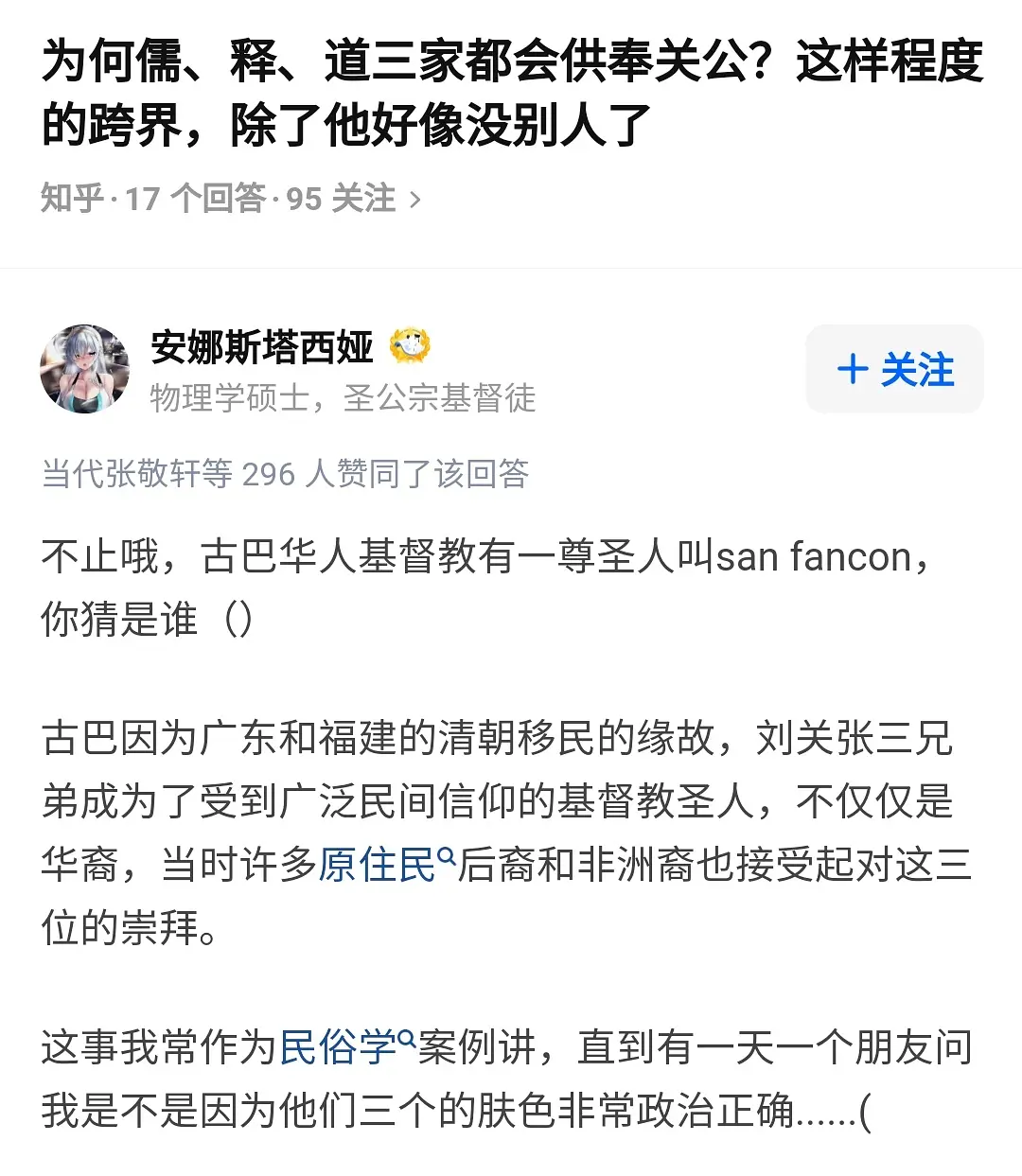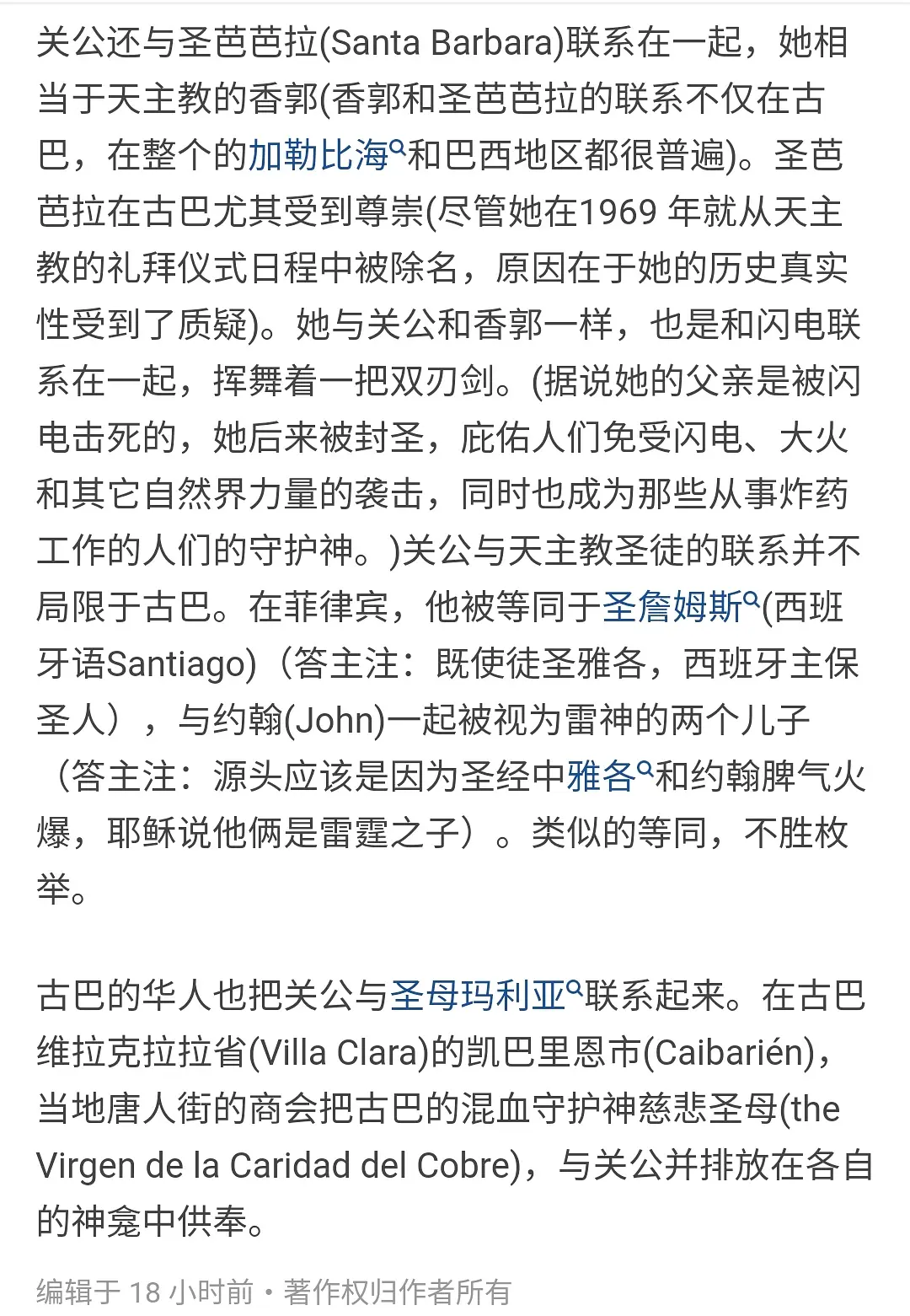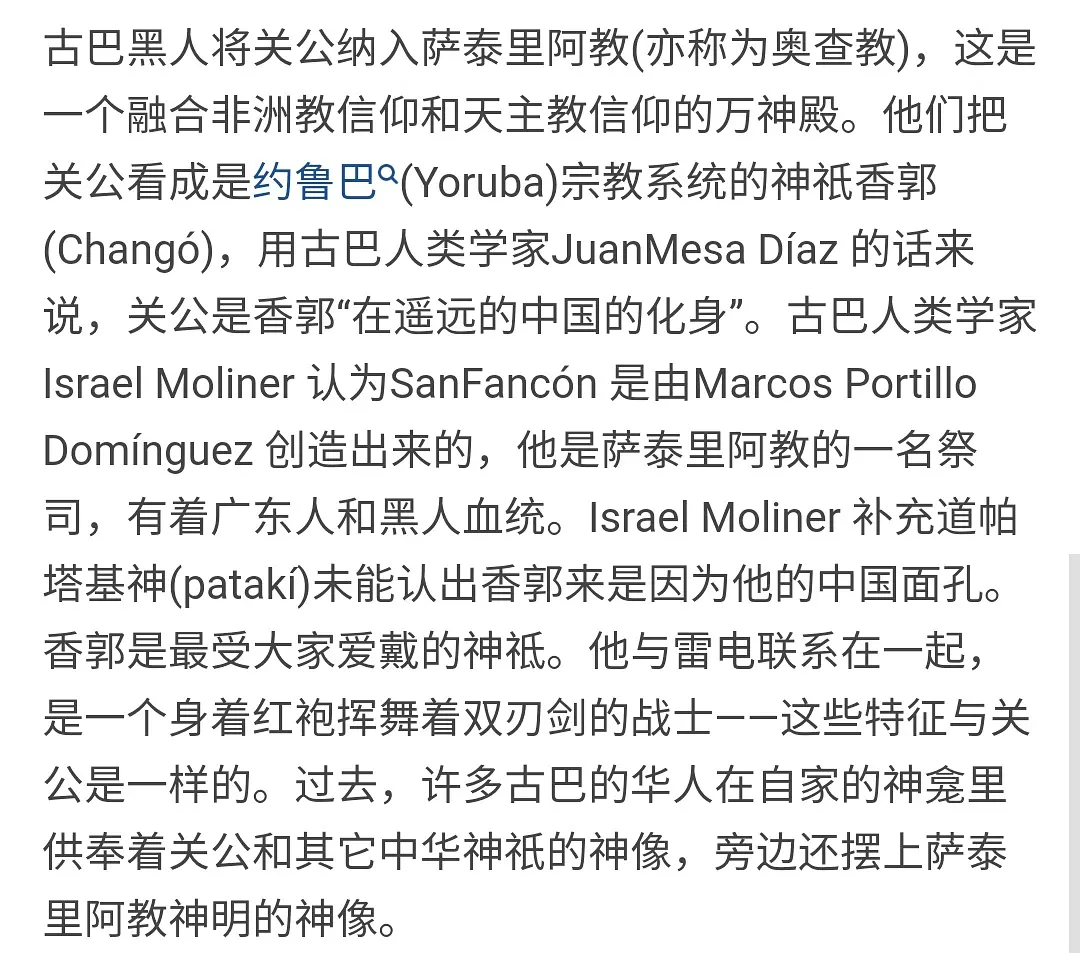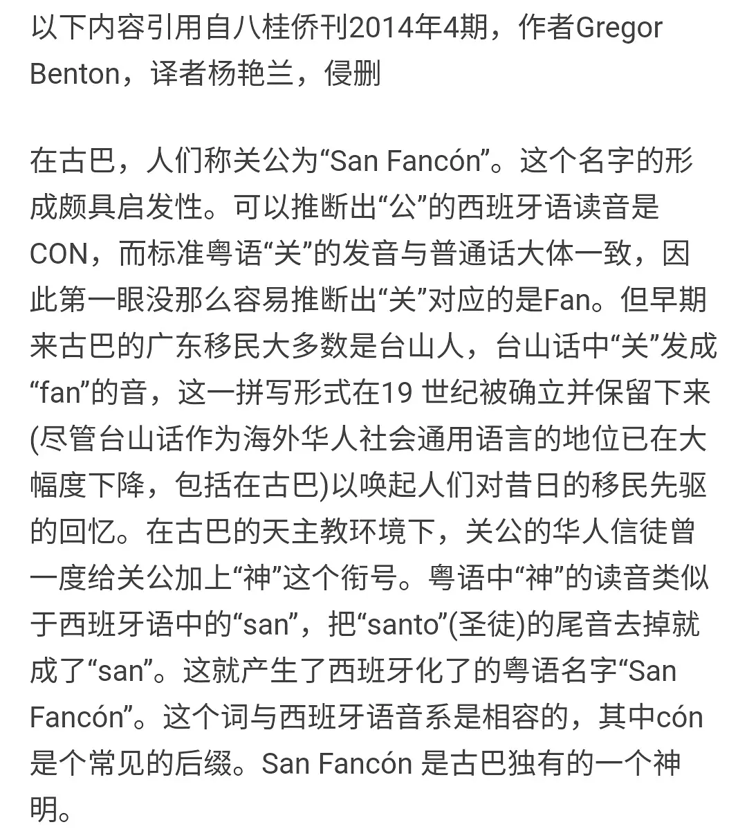 粗略看了下,这篇文章没标明出处。其大规模引用的原文是《关公与观音:两个cn民间神在古巴的变形》,不仅有关公喔。它作为文化漂移的一个非常有趣的案例,我觉得能和希腊化时期的塞拉皮斯崇拜相提并论