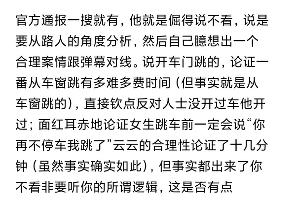 官方通报一搜就有,他就是倔得说不看,说是要从路人的角度分析,然后自己臆想出一个合理案情跟弹幕对线。说开车门跳的,论证一番从车窗跳有多难多费时间(但事实就是从车窗跳的),直接钦点反对人士没开过车他开过;面红耳赤地论证女生跳车前一定会说“你再不停车我跳了”云云的合理性论证了十几分钟(虽然事实确实如此),但事实都出来了你不看非要听你的所谓逻辑,这是否有点