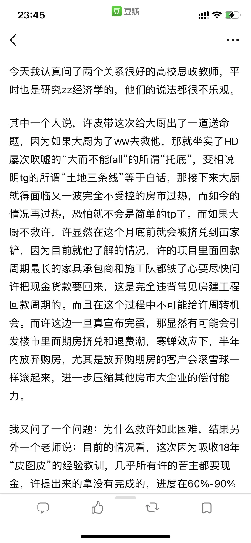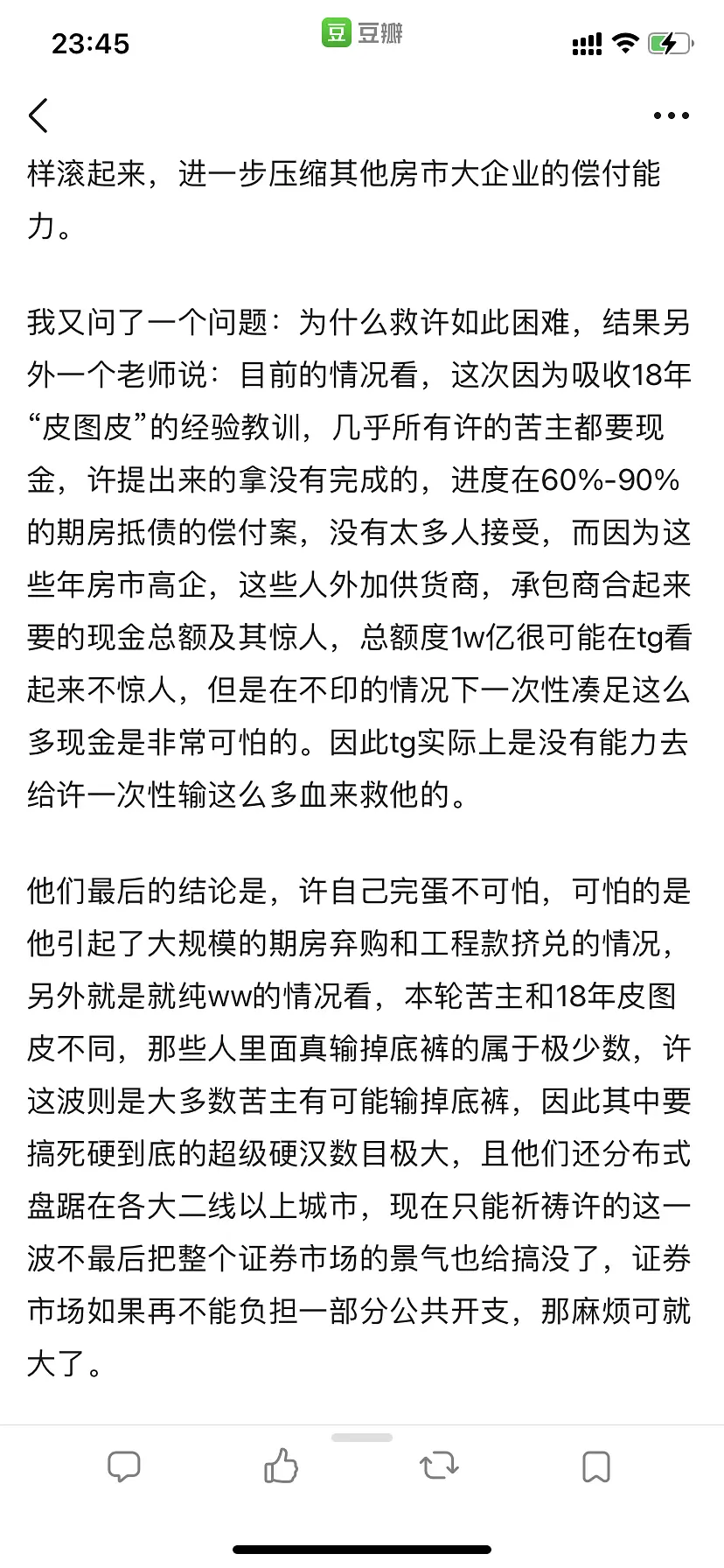2.宣布救许,但是只是吹的牛皮震天,实际上没真的用多少钱去救,或者说按照他们的逻辑,就指定先把建筑工人工资结清,结果是这个假利好消息刺激了L市很短一段时间坚挺,然后结果上崩的更快,因“大而不fall”说法短期内得到部分印证,吸引更多睿智加杠杆,结果完蛋。