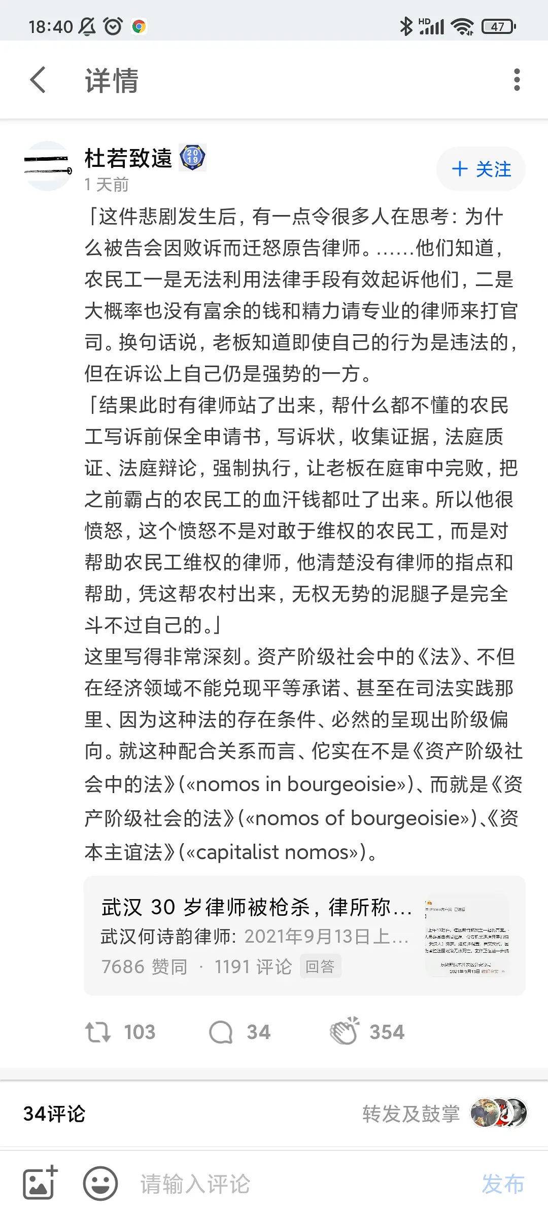 第一,也是最重要的一点:当事律师不是被任何state的暴力机关杀害的,而是被一个落魄兹本家个人的县中行为杀害的。杀死他的不是法律,而是一把自制土铳。我不认为法律在这次事件里起到了任何消极作用。