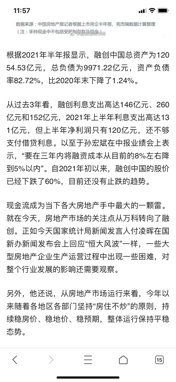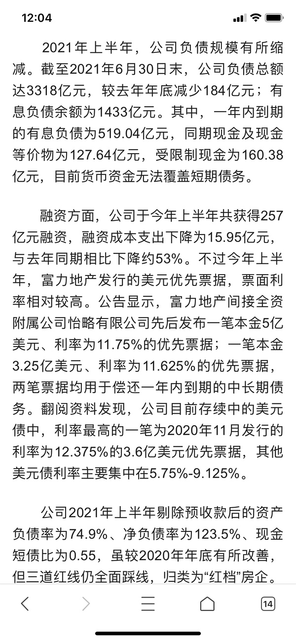 其他企业负债是因为盲目上规模,贷款拿地,然后抵押贷款再拿地,等于现金跨周期运作。想要维持住,就是暂缓还债、赶紧卖房、回笼资金,现金别断掉就还有生机。就怕……