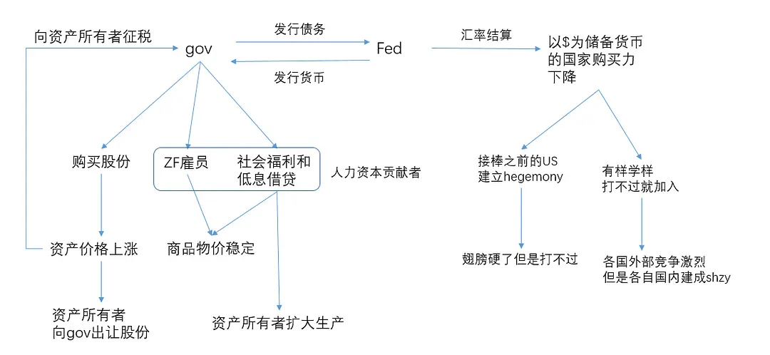 zf取代央行后,根据自己需要印发货币,为雇员发放工资,提供基本收入,多余的货币会被用来购买上市公司的股份,满足了从危机中走出的企业的需要,同时也将通胀控制在资本市场。(全民福利)