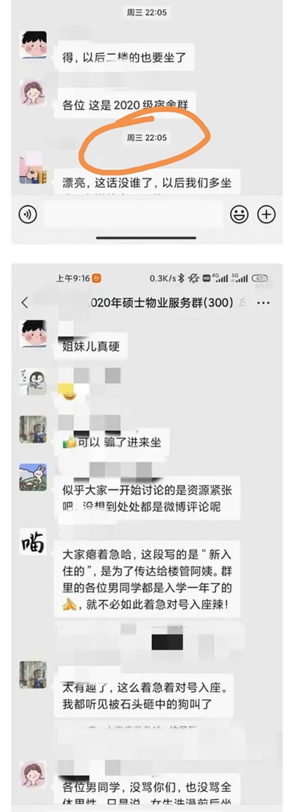 22:05是上面的截图,那一句“漂亮,以后我们多坐……”根本都没截全,有没有别的发言也不知道,你怎么这么肯定下面的截图就是在这七分钟里发出来的?而且是男生首先把一个简单的宿管规定问题扭曲成男女矛盾问题,这个不能否认吧?