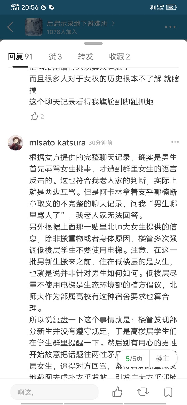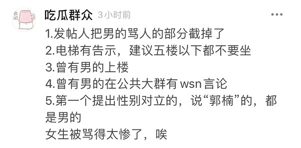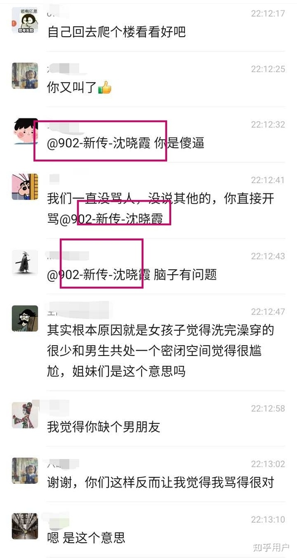 所以说复盘一下这个事情就是:楼管发现部分新生并没有遵守规定,于是高楼层学生们在学生群里提醒一下。然后别有用心的男性开始故意把话题往两性矛盾上引,辱骂高楼层女生,逼得对方回骂,紧接着就断章取义地截图去虎扑支乎发帖,引发广大支乎郭楠们的狂欢,刻意营造出一种“女性又在侵犯男性生存空间”的氛围。如果女人没有办法上网,那么此事大概就像郭会纵火案一样“坐实”了。可惜的是女人也能上网,也能发出声音,也会把事情原原本本地给所有人讲出来。