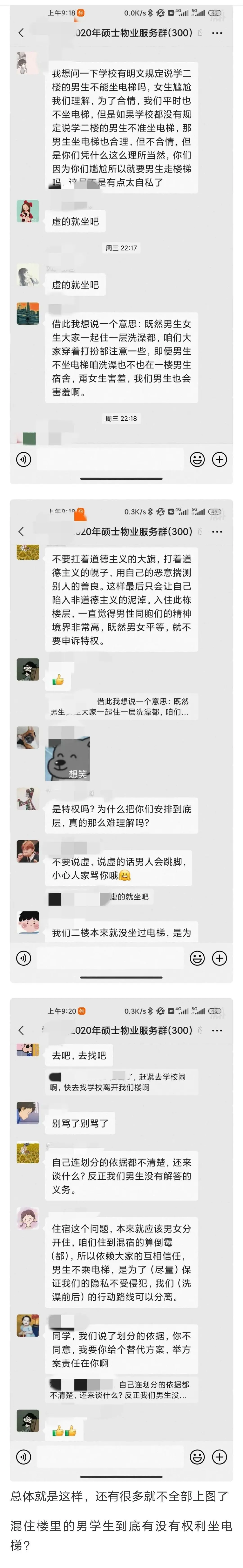 低楼层学生拒绝服从楼管和宿管部门的安排,那我对此没有异议。但是他们拒绝服从的对象是高楼层女生,事实上后者根本就没有强制他们怎么样的能力,只是说一下有这个规定而已。然后低楼层学生就开始把话题往性别议题上扯,请问这不是故意挑衅是什么呢?