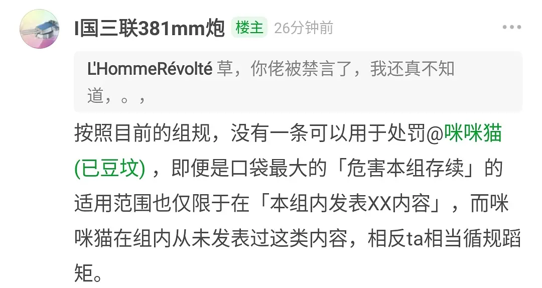 已ball消我暂时尚未发现有ta在组内违反组规的行为,而挂在主楼的证据链也是在组外发生的行为。