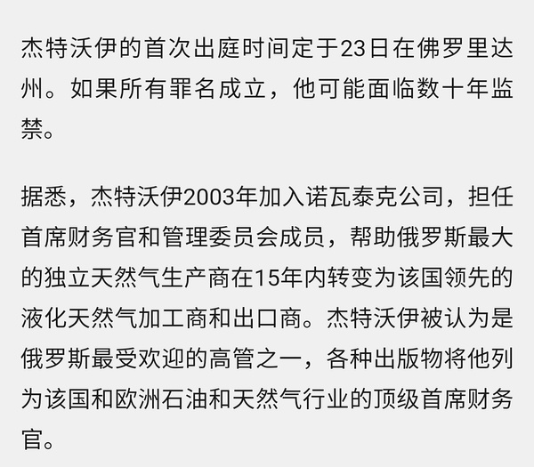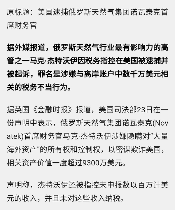 美国逮捕俄国天然气巨头诺瓦泰克的CFO