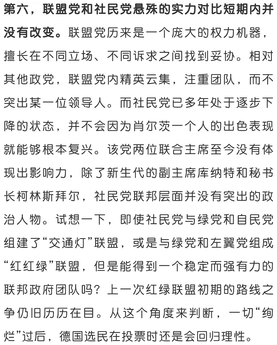 其次,cdu这4年执政就是一坨屎:低碳低碳没做好,核电废了导致电价涨得老百姓绷不住了,莱茵洪灾闹出大量笑话。工业信息化好死不死还得依靠spd在部分州大力推动才勉强有效果,教育和社会难民问题上两边都不受欢迎,还有非常多土耳其裔问题,我在德国的朋友以前投cdu的现在都直接放弃投票了,他直接辱骂cdu是嘻嘻屁第二的😅