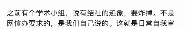 “之前有个学术小组,说有jie she的迹象,要炸掉。不是网xin ban要求的,是我们自己说的。这就是日常自我审查”