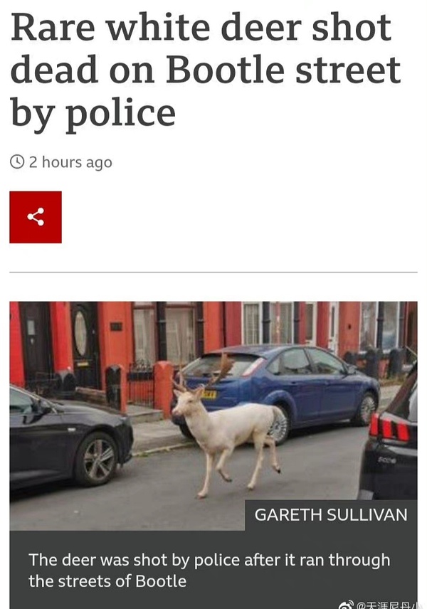 白鹿跑到英国街道上被击毙(不知道这种是不是就是孔子看到的麒麟)